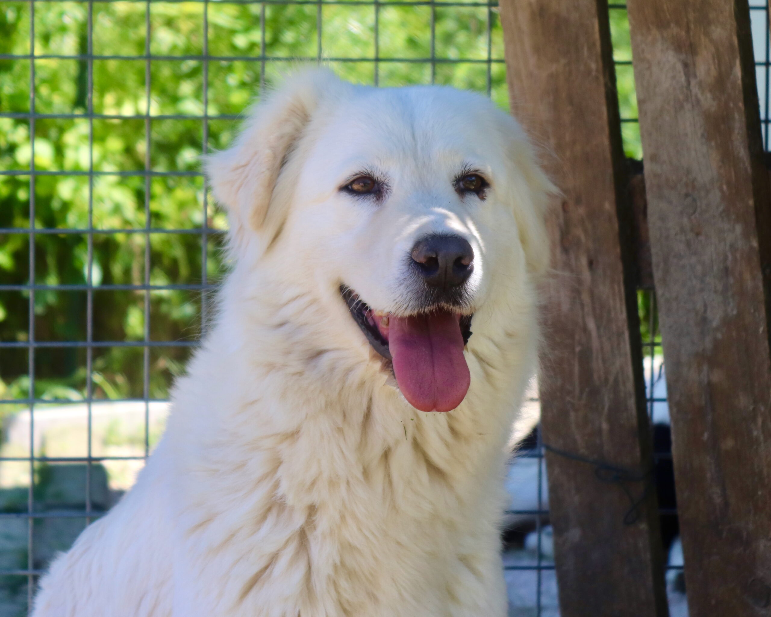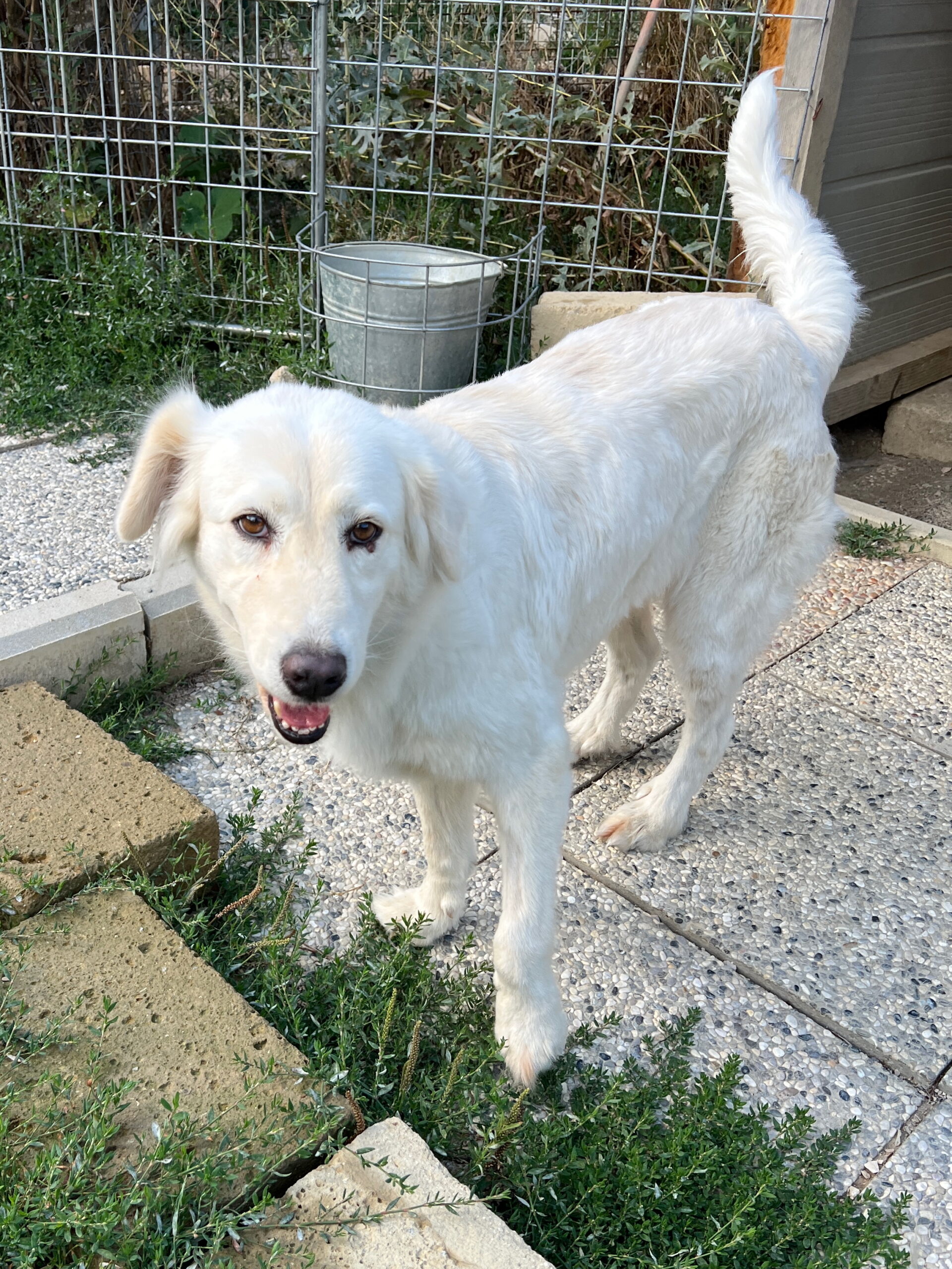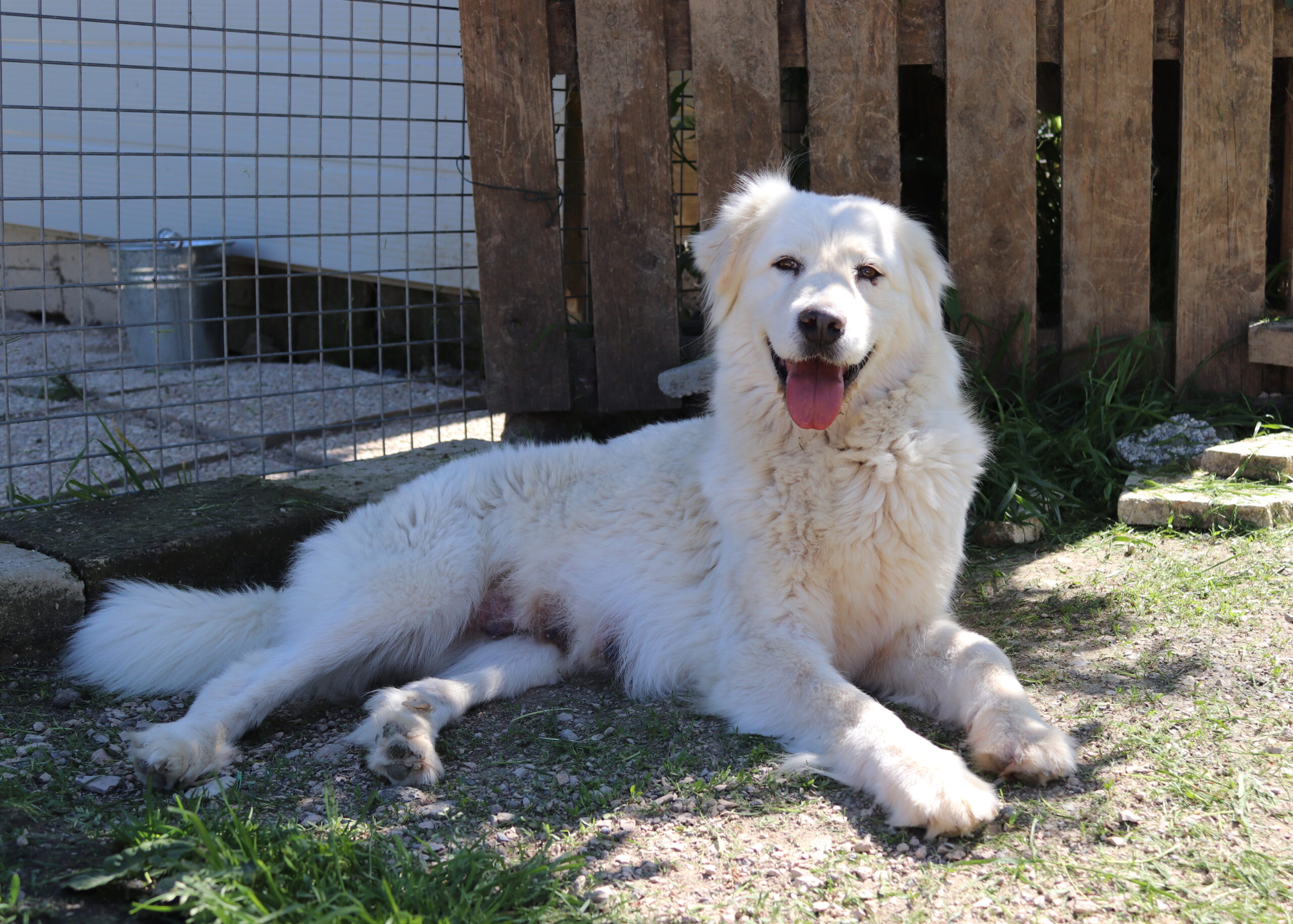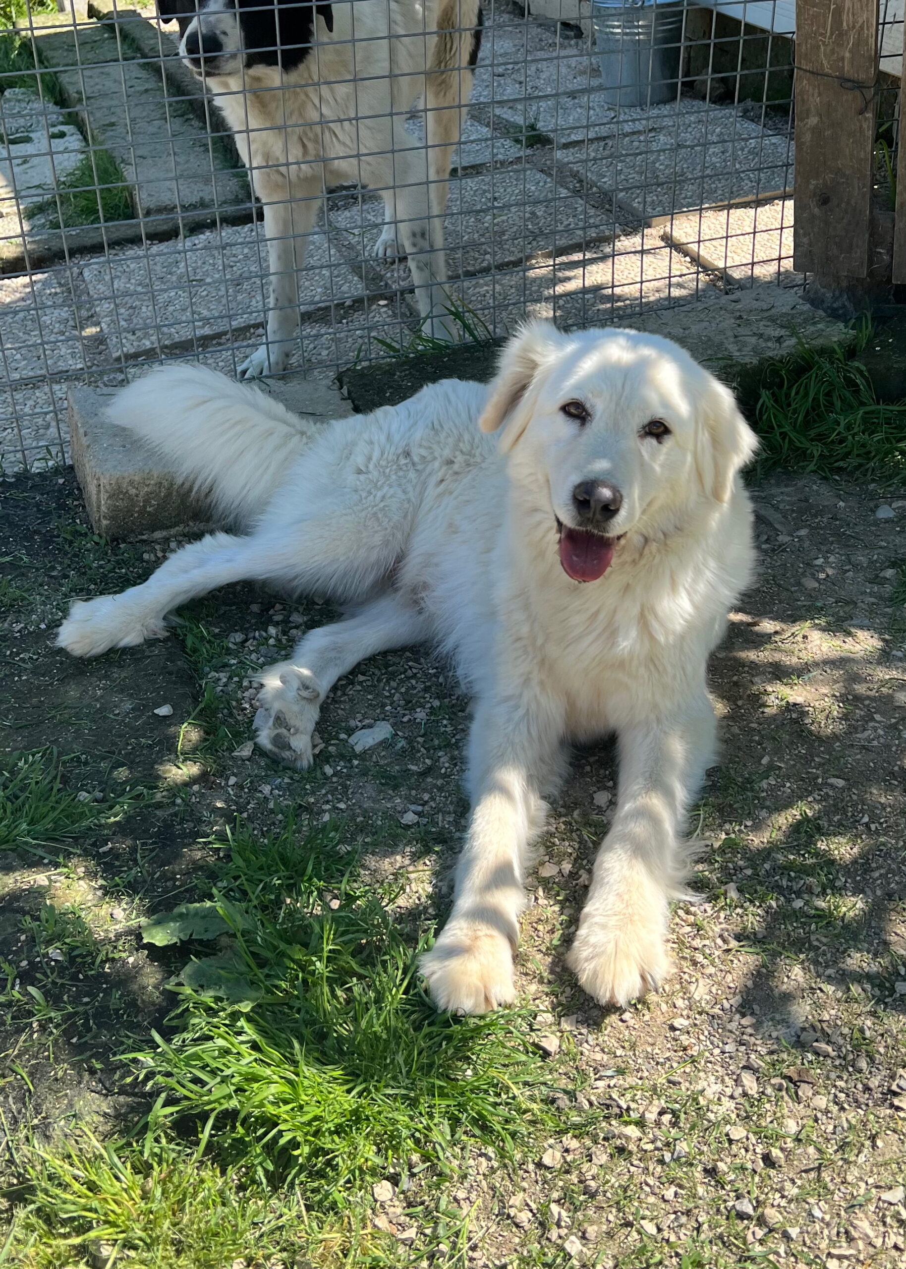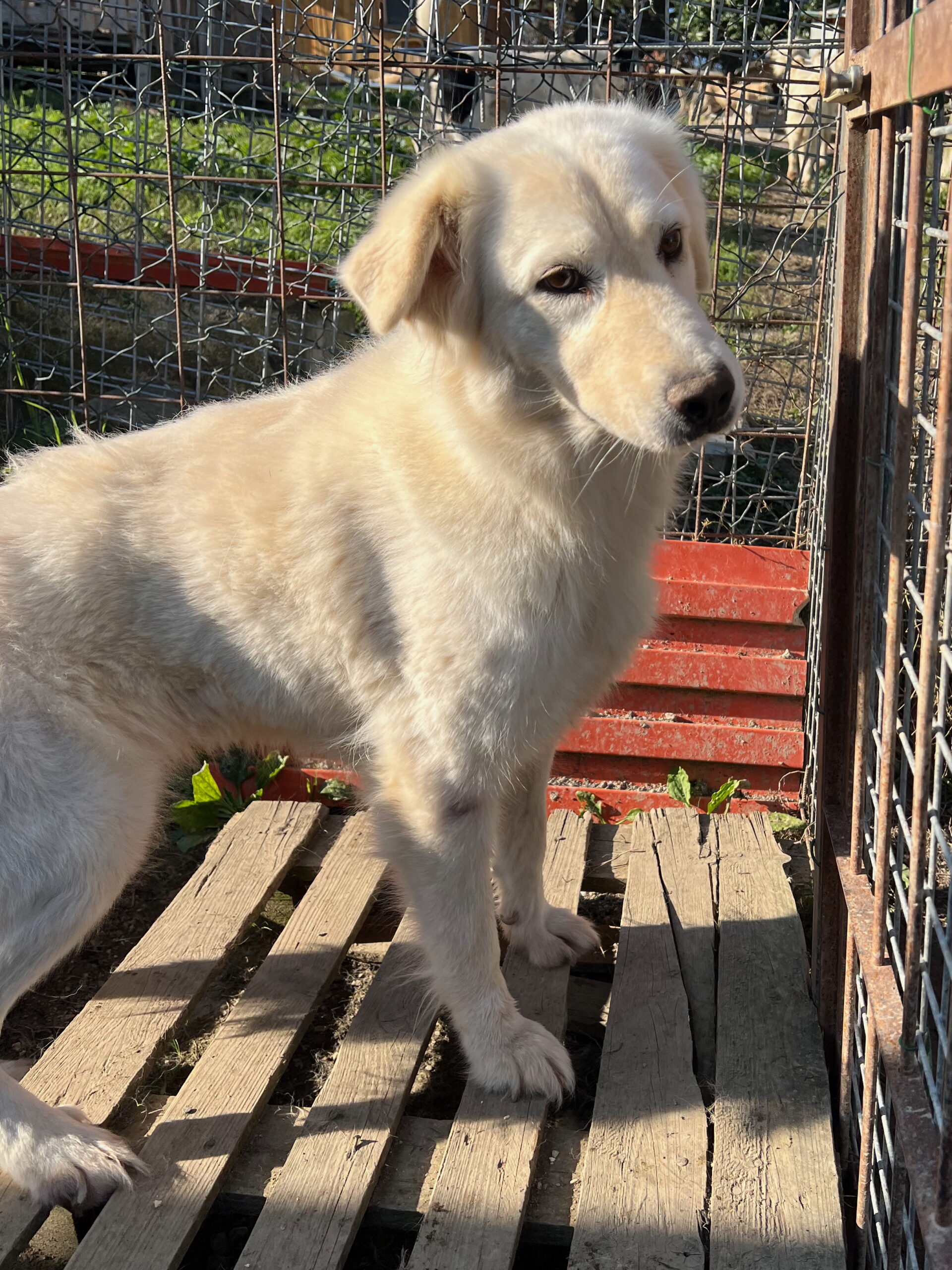 09/2025: Bella ist eine wirklich sehr hübsche und offene Maremmanomix Hündin. Sie saß bis Mai 2025 mit ihrem Kumpel Rusty zusammen. Dieser hat nun ein  Zuhause gefunden und auch Bella möchte gerne zu ihrer eigenen Familie ziehen. Die schneeweiße Bella ist eine freundliche Hündin, die aber auch eine laute Stimme hat, die sie immer wieder unter Beweis stellt. Leckerlies und auch Streicheleinheiten nimmt sie sehr gerne an. Sobald man sich ihrem Gehege nähert, kommt sie einem freudig entgegengelaufen. Aktuell teilt sie sich ihr Gehege mit Balto und Emy.