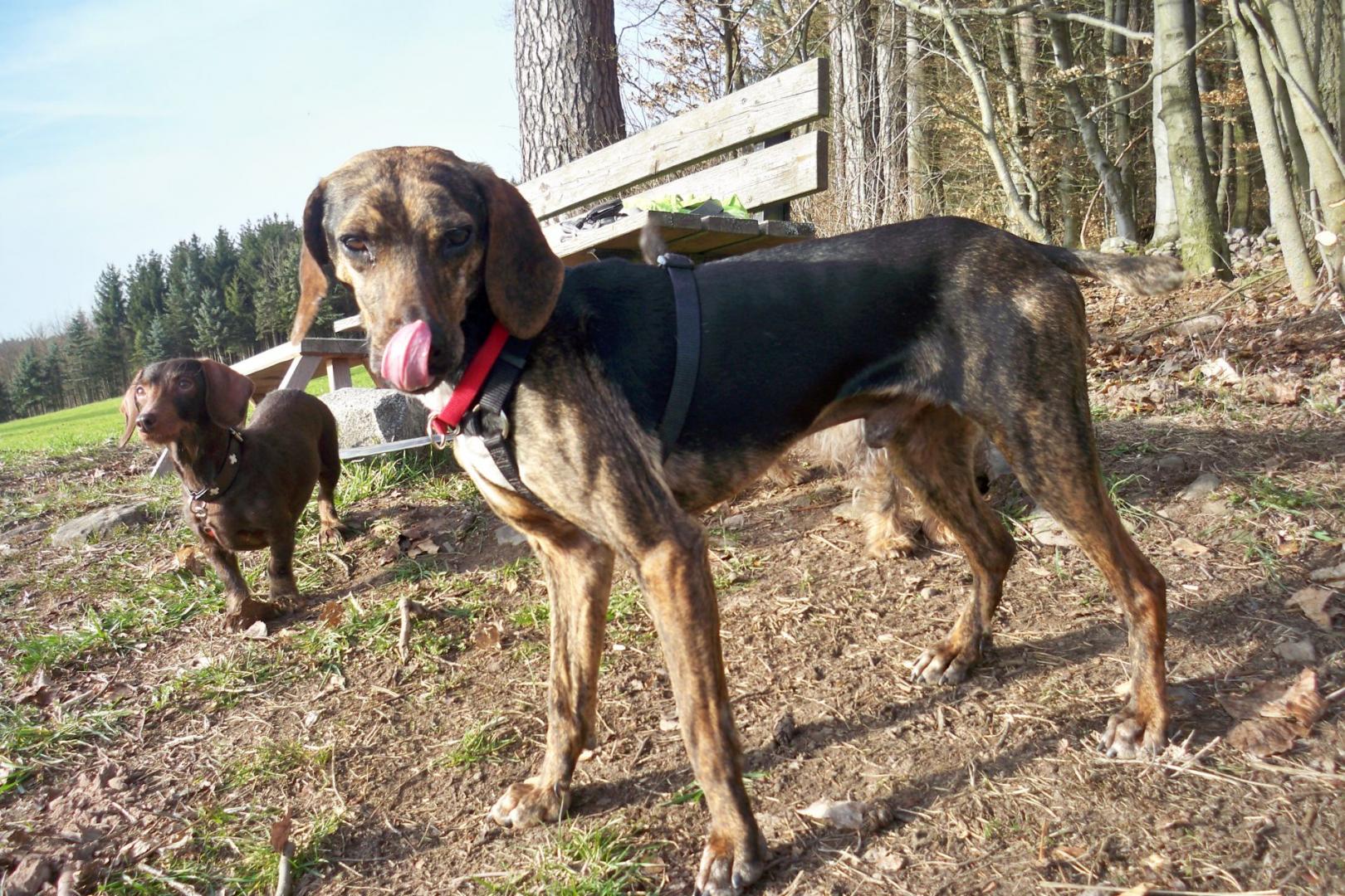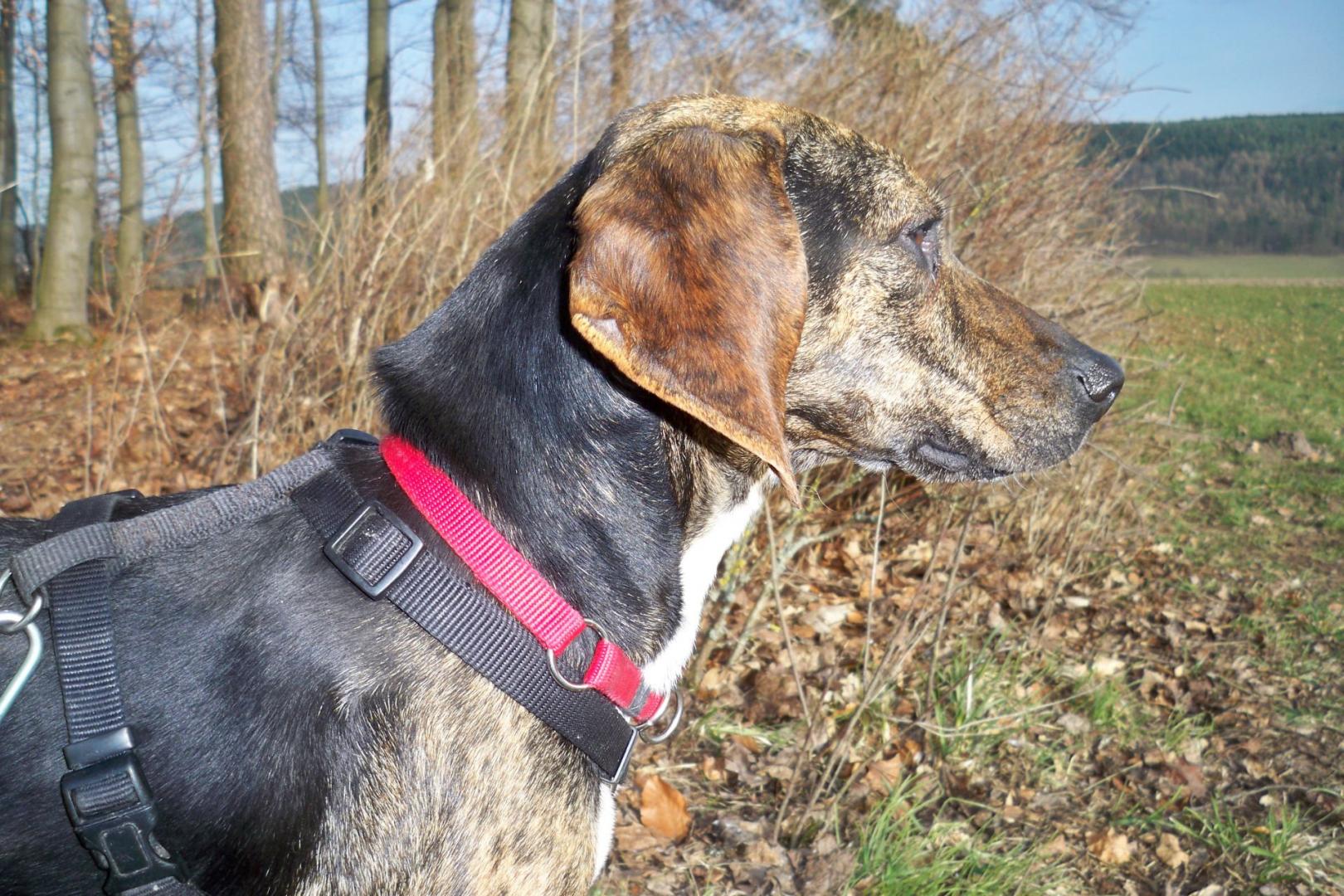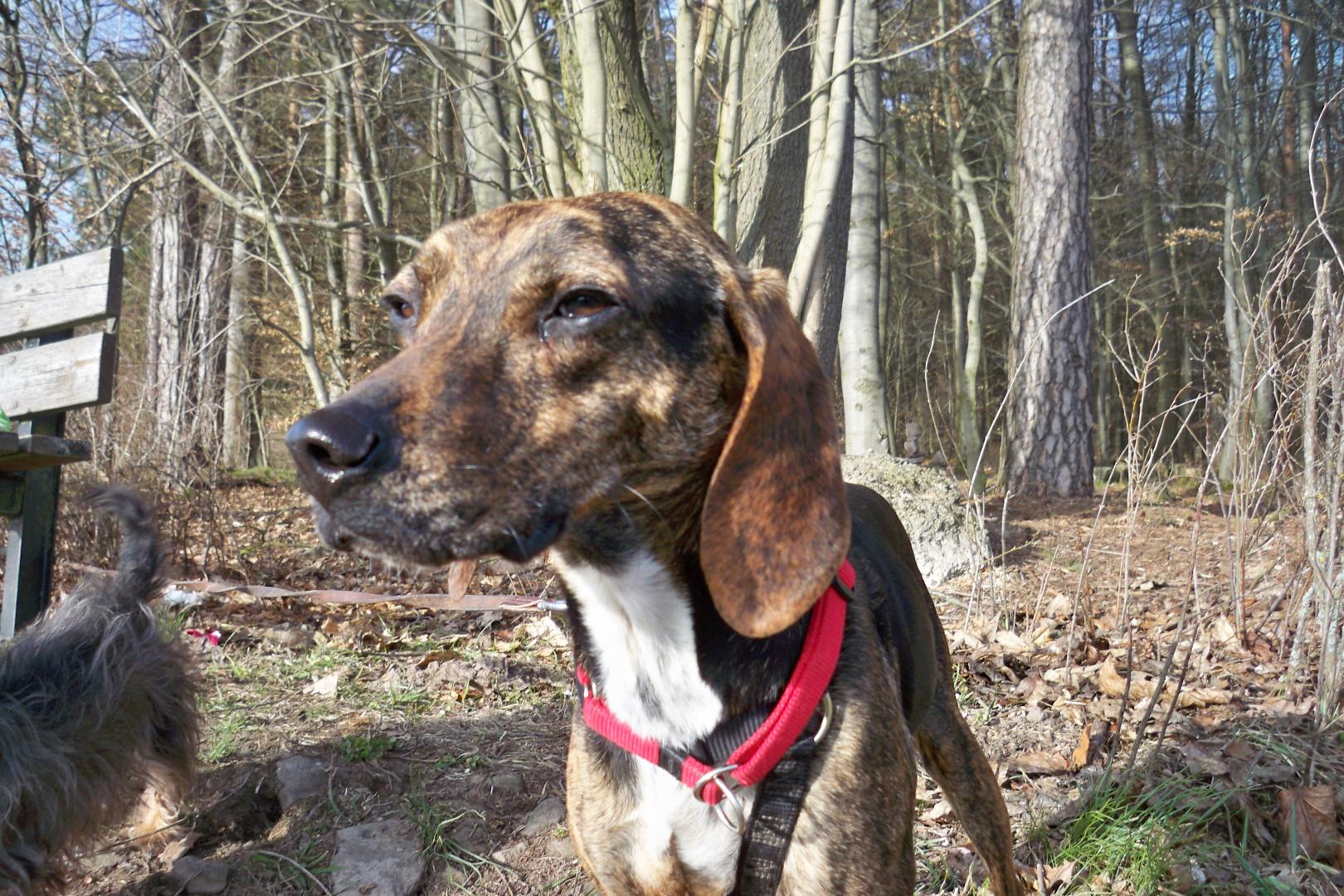Nach knapp zwei Wochen auf seiner Pflegestelle entwickelt sich Campo super! Autofahren? Leichteste Übung. Brav legt er sich ab. Egal, ob er auf dem Sitz oder im Kofferraum transportiert wird, Campo bleibt geduldig und entspannt, selbst bei langen Strecken. Genauso locker wie beim Autofahren klappt es an der Leine. Der goldige Rüde läuft aufmerksam neben seinem Pflegefrauchen und lässt sich durch nichts beirren. Überhaupt findet er sie ganz toll. Wenn sie zur Arbeit geht, verfolgt Campo spurtreu ihre Fährte. Er ist ein optimaler Kandidat für Nasenarbeit, Mantrailing oder Fährtensuche. Diese Auslastung wäre auch hilfreich, um seinen Jagdtrieb in Zaum zu halten. Hasen findet er absolut verlockend und würde sicher jagen, wenn er die Gelegenheit dazu bekäme. (Frauchens Hühner sind ihm allerdings suspekt und er macht einen großen Bogen um sie) Campo ist wirklich sensibel. Er sucht die Nähe und genießt die Streicheleinheiten, die er noch nie zuvor erleben durfte. Langsam taut der süße Segugiomix auf, fängt an zu Spielen und im Garten aus Herzenslust zu Rennen. Mit Hunden versteht er sich top. Ein Zweithund würde ihm sicher hilfreich sein. Campo hat Probleme mit dem Alleinebleiben. Es erfordert noch ein ganzes Stück Training, bis er selbstsicher genug ist, um seine Menschen nicht herbeizubellen. Ansonsten benimmt er sich auch in ungewohnten Situationen angenehm zurückhaltend, aber nicht ämgstlich. Bei einer größeren Feier mit vielen Leuten, legte er sich in diskretem Abstand brav ab. Manchmal begrüßte er die Gäste mit freundlichem Wedeln, wurde aber nie aufdringlich oder bettelte. Ein wahrer Musterhund. Die Stubenreinheit wird immer besser und bald wird es ihm auch weniger ausmachen zeitweise alleine zu bleiben. Wir sind gespannt wie sich der Herzenshund weiter entwickeln wird…