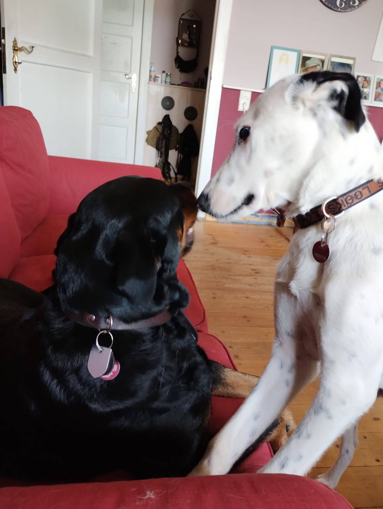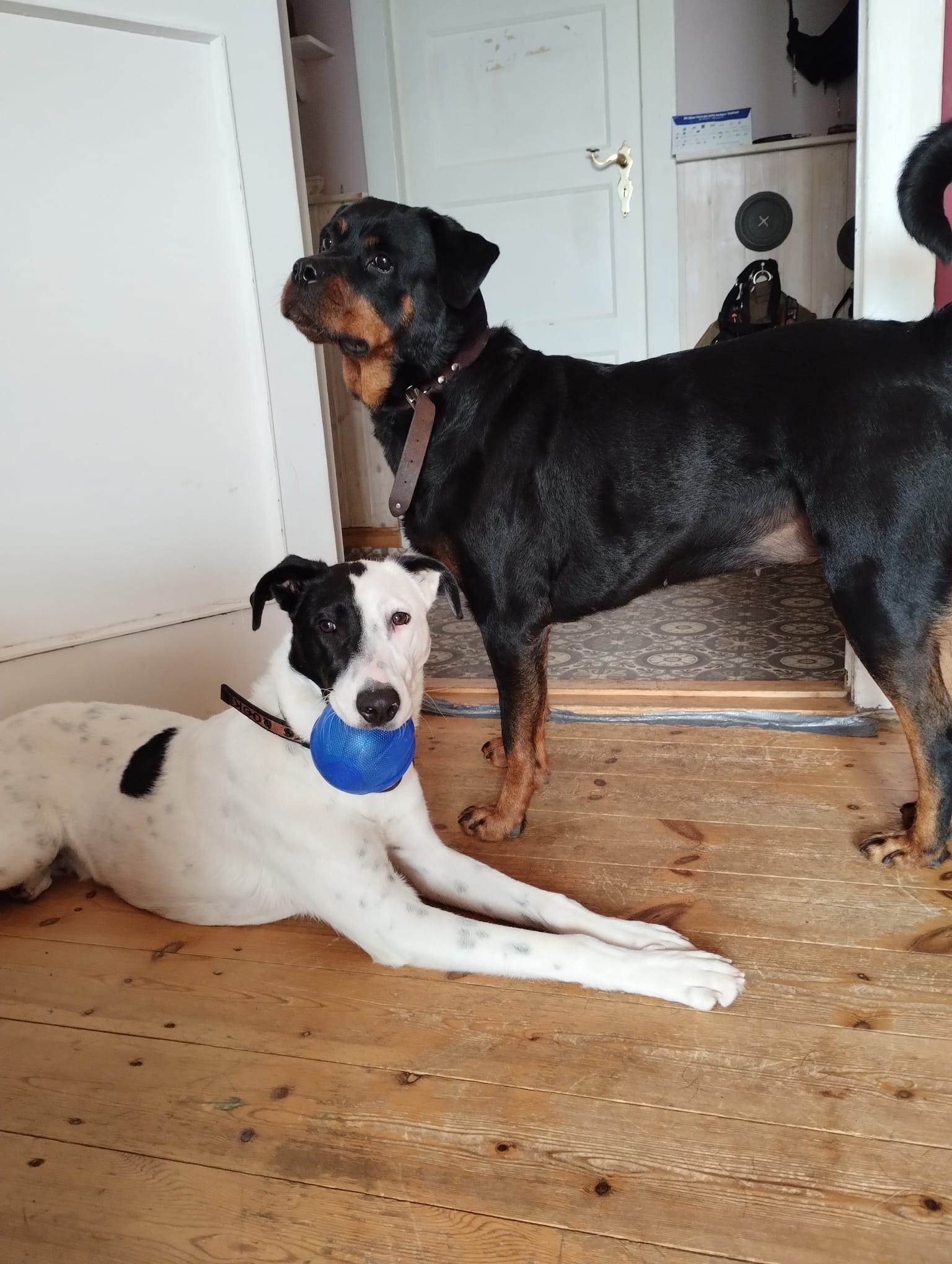Beim Erblicken von Artgenossen pöbelt er ordentlich.. bleibt der Hund gegenüber entspannt und lässt einen Kontakt durch Carlos zu, fällt die Anspannung und Carlos geht zur Spielaufforderung über. Am 06.12.25 ergab sich ein Kontakt mit 2 unbekannten Bordercollie-Rüden; nach ca. 15 min Beschnüffeln und einem Nebeneinander-Herlaufen, war das Eis gebrochen und das gemeinsame Spielen und Rennen stand auf dem Programm. Das Frauchen dieser beiden Bordercollis ist aktive Agility-Hundesportlerin und bestätigt, dass Carlos ein lieber Kerl mit angestauter Energie ist, welche super gut für Hundesport genutzt werden kann und sollte.