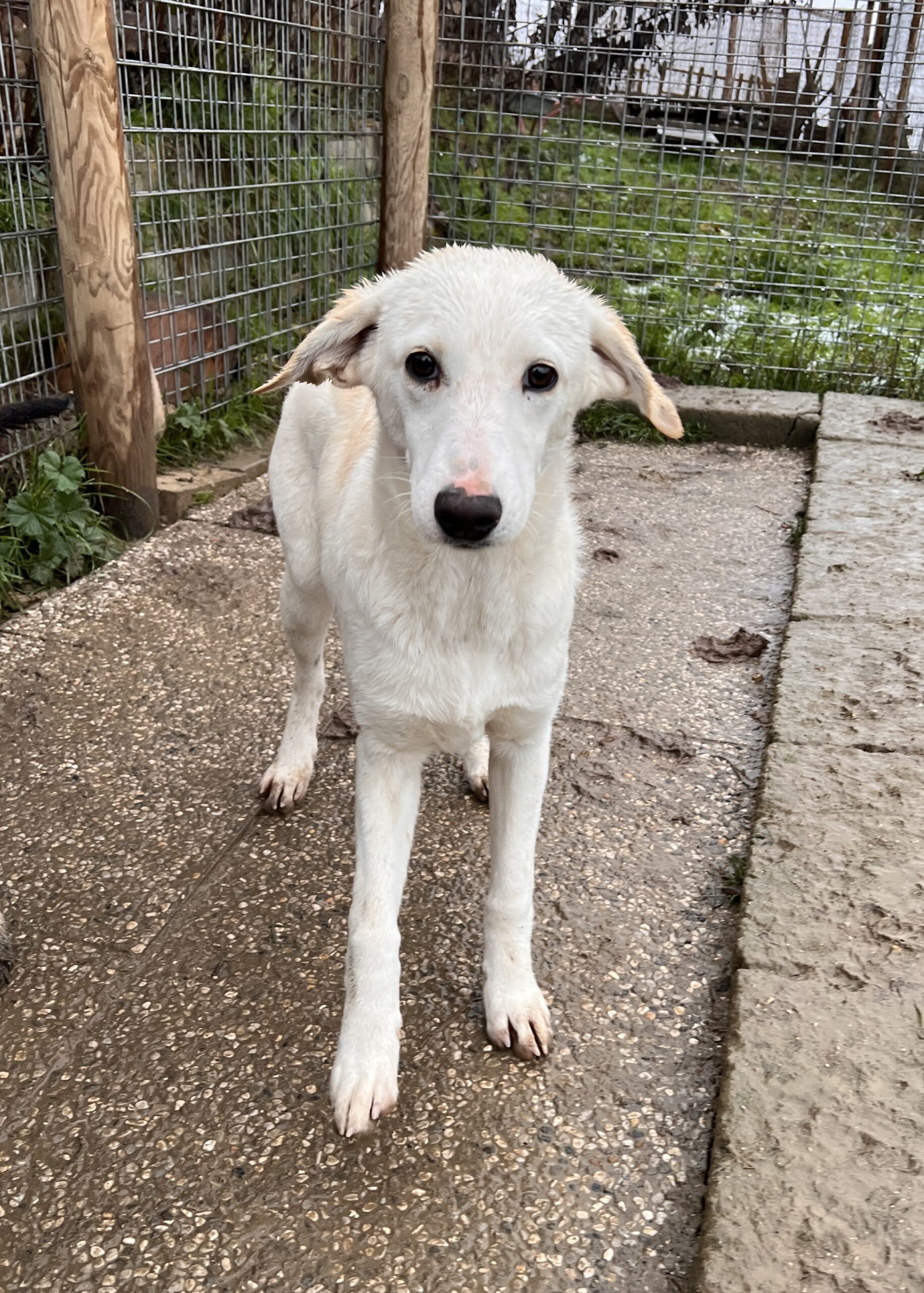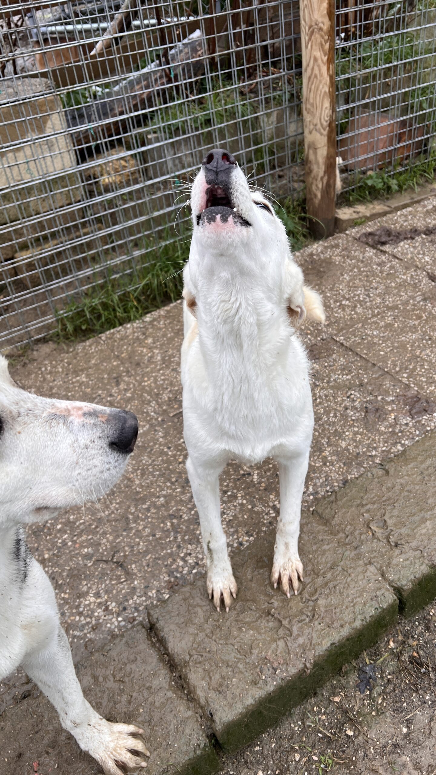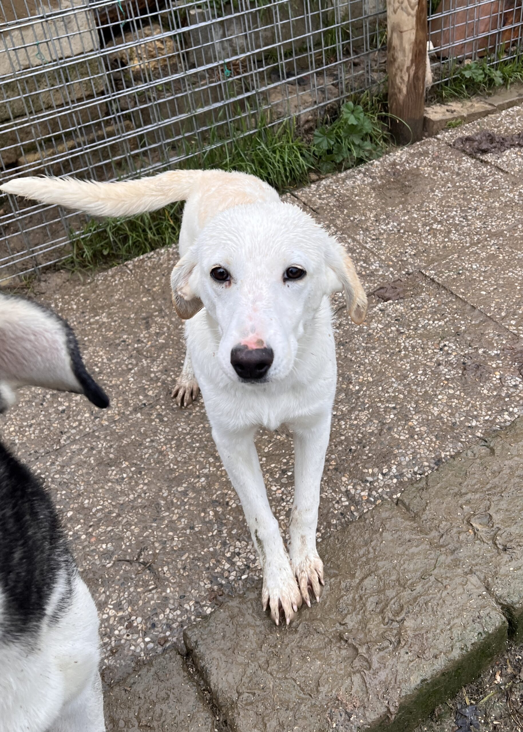 In der Auffangstation lebt sie in einem gemischten Rudel und ist sowohl mit Rüden als auch mit Hündinnen verträglich. Menschen gegenüber ist sie noch etwas schüchtern, aber sie ist neugierig und nimmt Kontakt zum Menschen auf. Aktuell hat sie eine Schulterhöhe von 48 cm, aber sie wird wohl noch ein paar Zentimeter wachsen.
