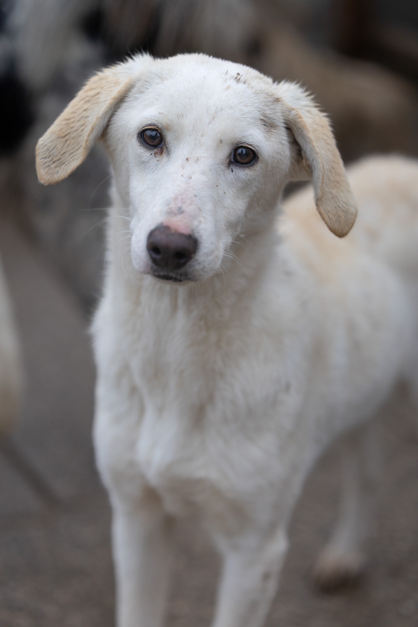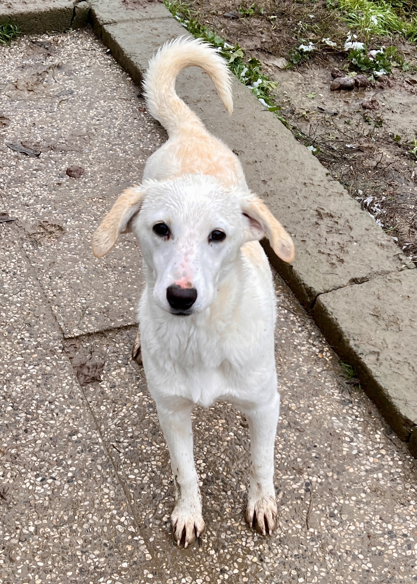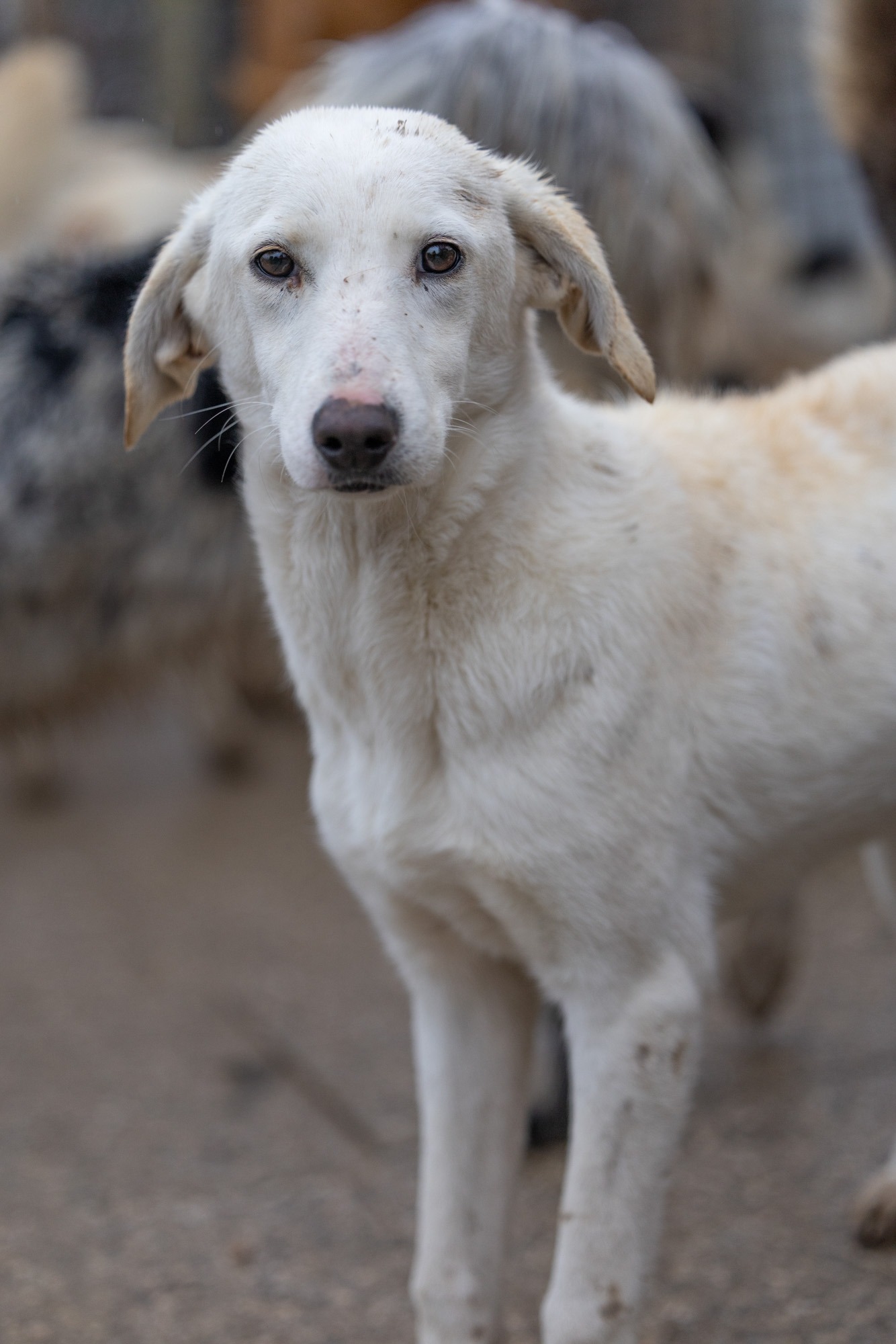 In der Auffangstation lebt sie in einem gemischten Rudel und ist sowohl mit Rüden als auch mit Hündinnen verträglich. Menschen gegenüber ist sie noch etwas schüchtern, aber sie ist neugierig und nimmt Kontakt zum Menschen auf. Aktuell hat sie eine Schulterhöhe von 48 cm, aber sie wird wohl noch ein paar Zentimeter wachsen.