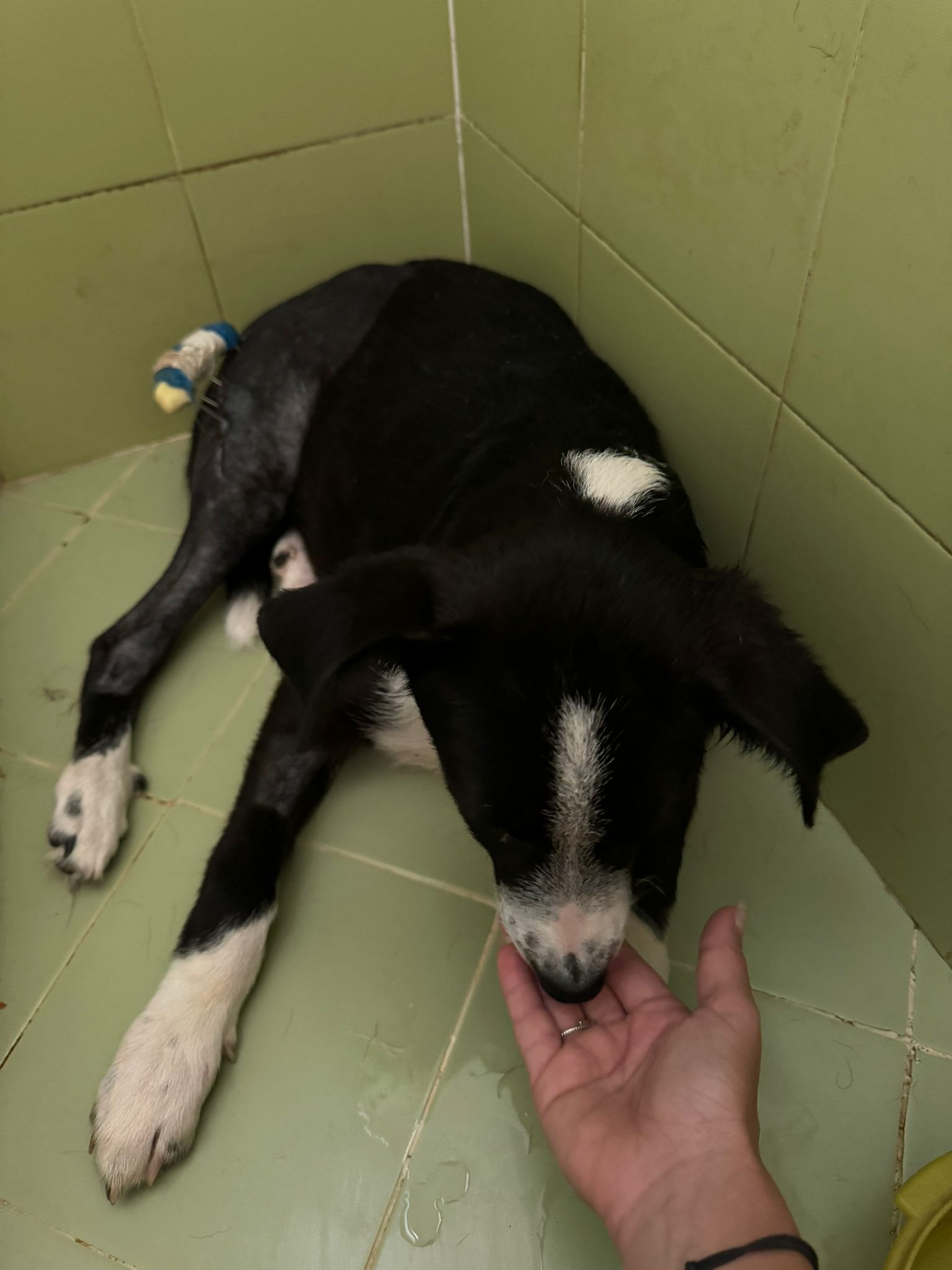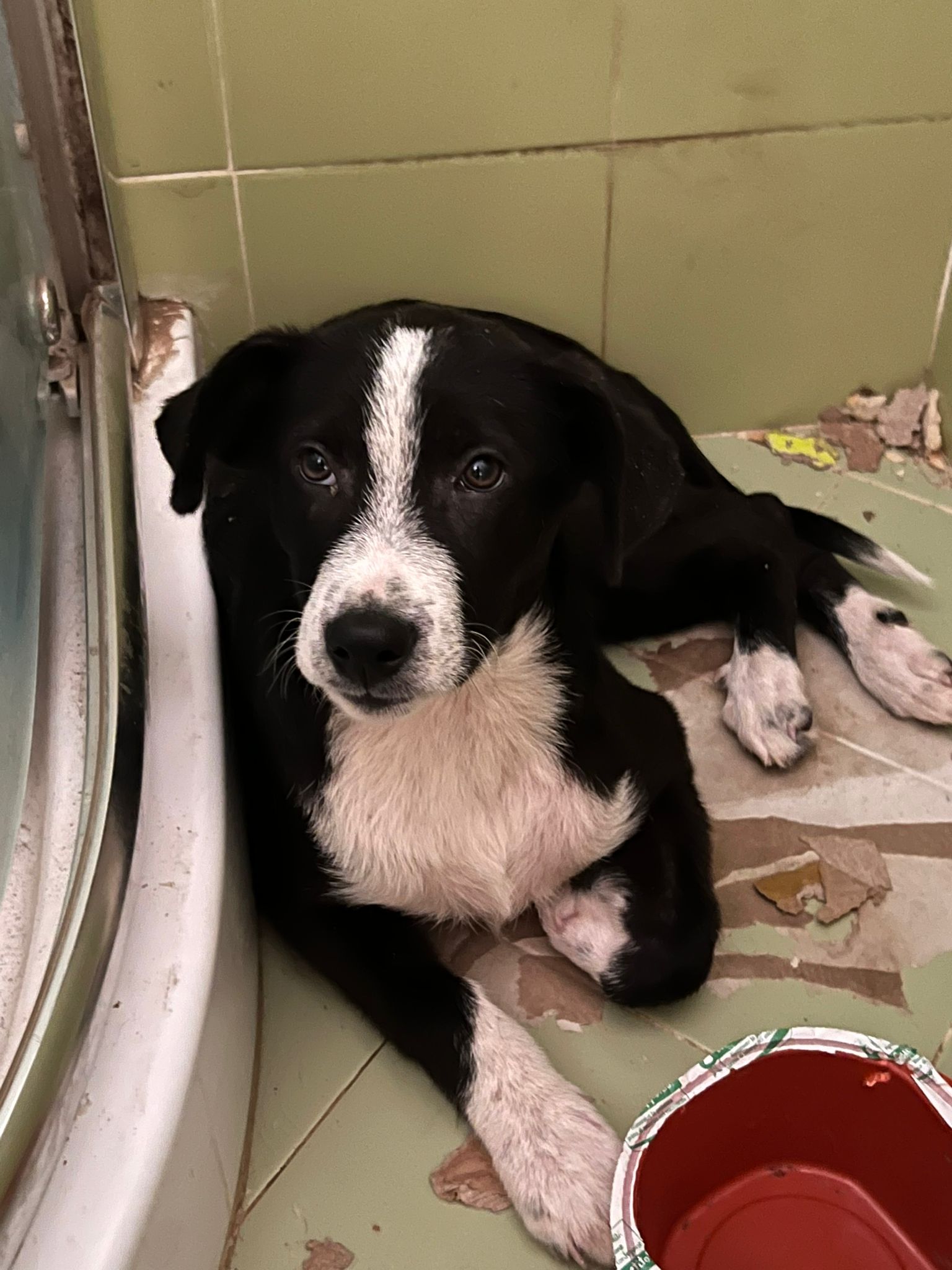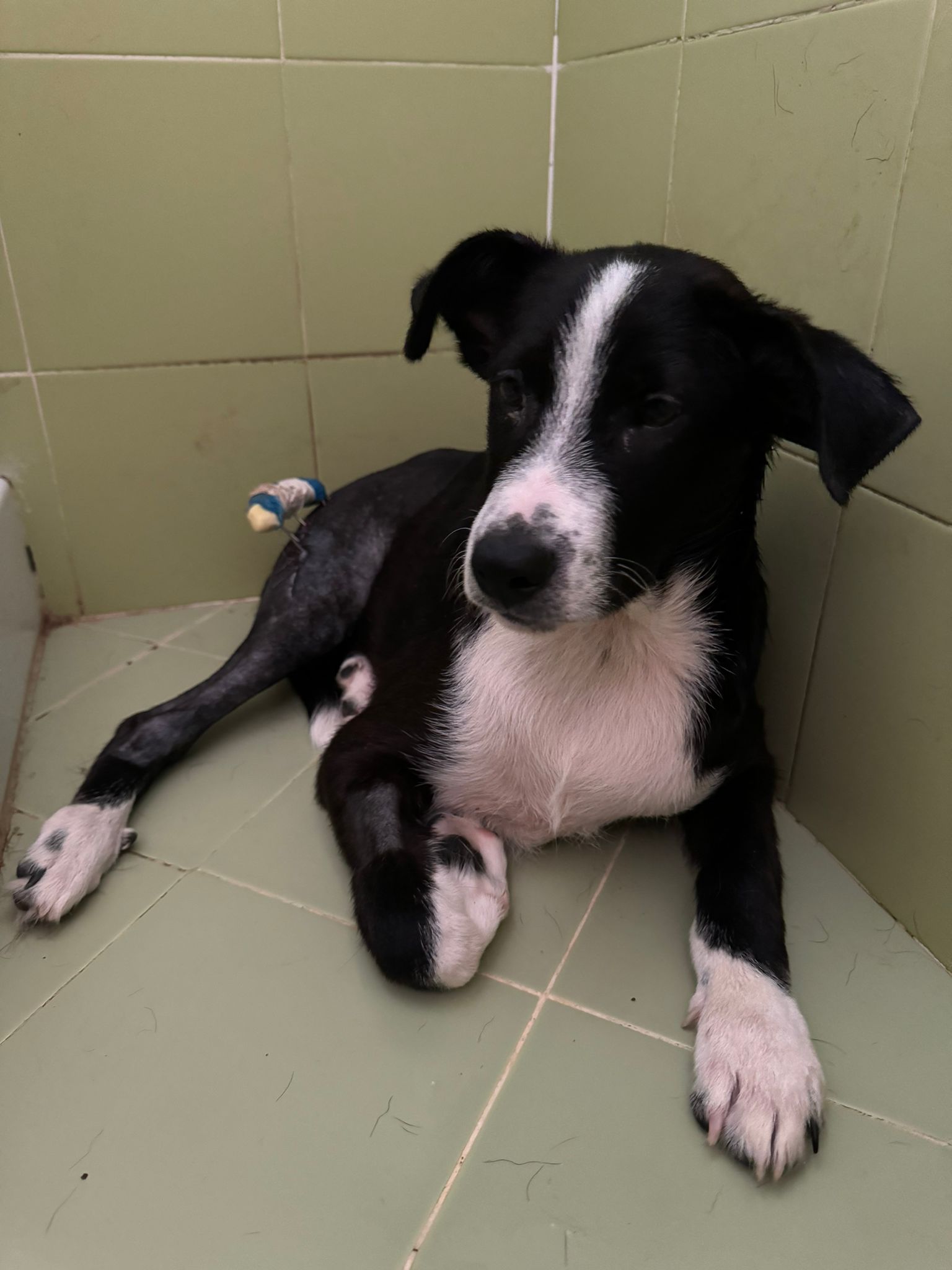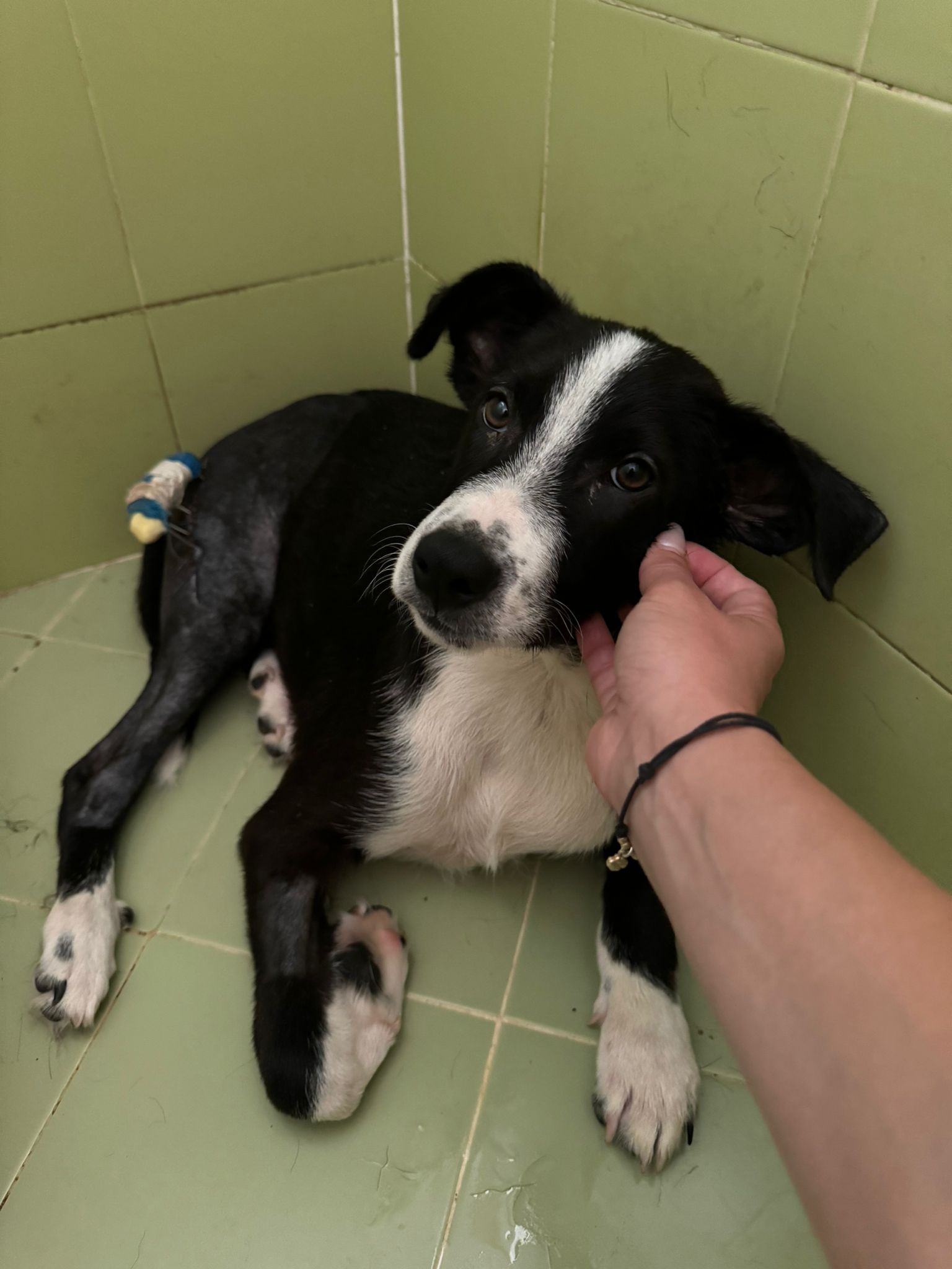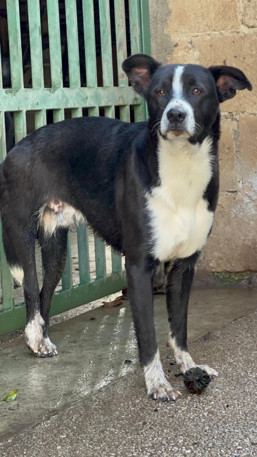 Mimmo wurde mit gebrochener Hinterpfote von Rosalba und Evelina gerettet als er 2 Monate alt war. Er wurde von einem Auto überfahren und liegen gelassen. Inzwischen ist der max. 8 Monate junge Rüde (Stand 10/2024) operiert worden, was nicht so ganz einfach war. Ein Außenfixateur war von Nöten, der jetzt im August in einer weiteren OP, entfernt werden muss. Es wäre dann natürlich für den weiteren Genesungslauf wichtig, dass er im Anschluss Physio bekommen kann. Leider für einen Hund in einem Canile ein Wunschtraum. Vielleicht finden wir aber einen Platz für ihn bei ganz tollen Menschen, die den lieben Kerl, der sich sehr gern streicheln lässt, zukünftig durchs Leben begleiten möchten. Mimmo ist sozial verträglich, zieht sich aber gerne von anderen Hunden zurück, ihm scheint bewußt zu sein, das er gehandicapt ist. Optisch könnte ein Border Collie in im drin stecken, wir gehen daher von einer mittleren Endgröße aus. Für einen Test auf Mittelmeererkrankungen ist er noch zu jung.