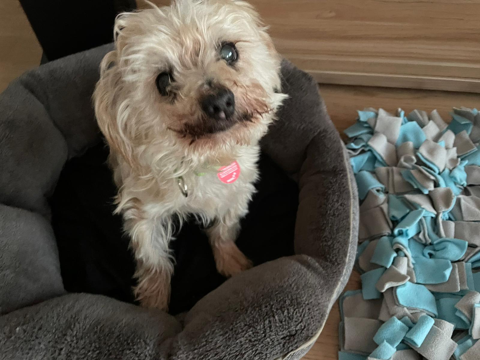 Er ist ein eigenständiges Kerlchen, er mag fressen, schlafen, Gassi, wie es dem Alter entspricht. Sehr gerne ist er überall dabei. Hören und Sehen funktioniert sehr eingeschränkt, aber er kommt gut damit zurecht! Am Kopf anfassen ist ok, am Körper muss es nicht sein. Daher mag er auch nicht gebürstet werden und beim Tierarzt trägt er einen Maulkorb.
