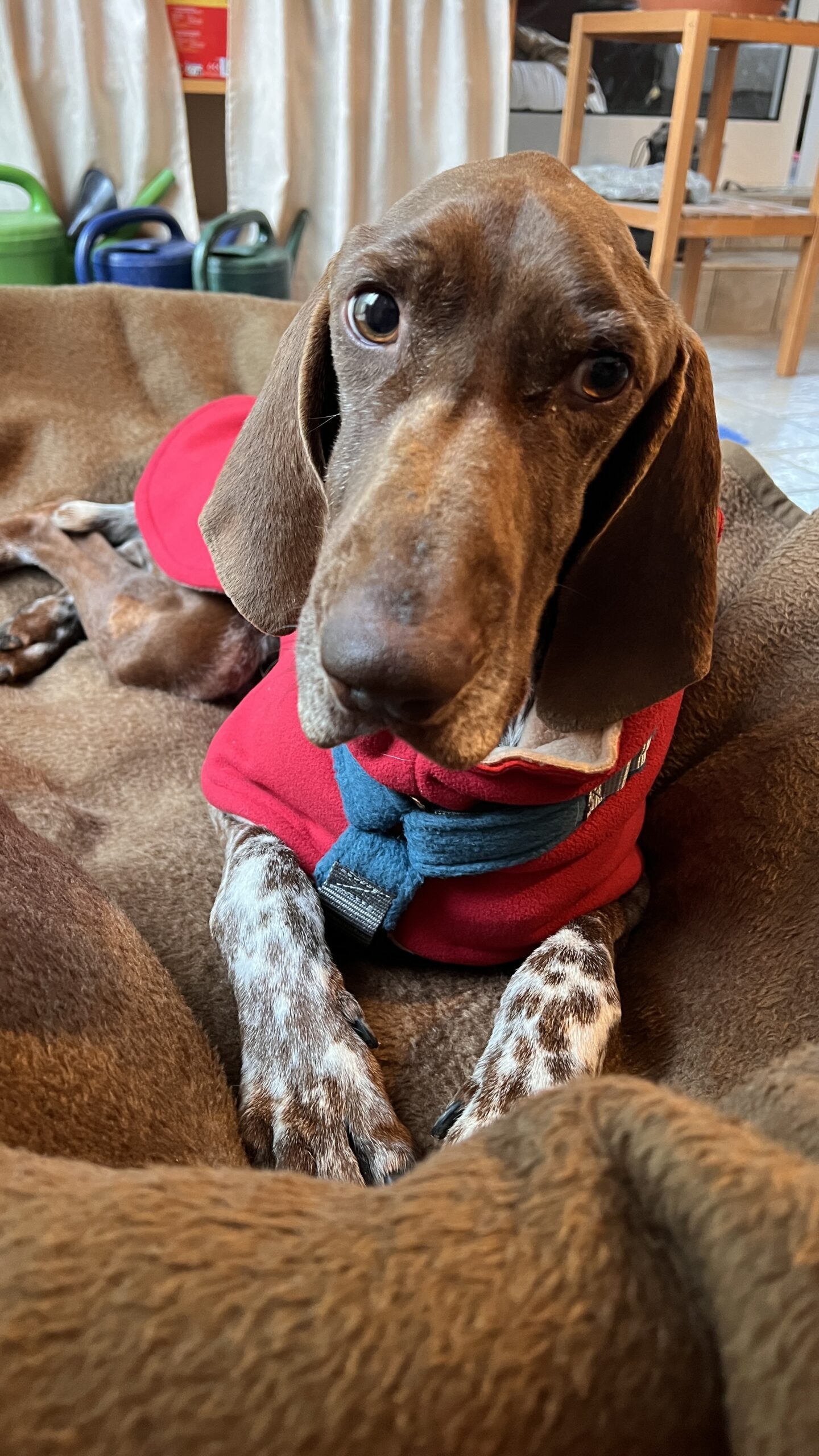 Aufgrund der Filarientherapie, des nasskalten Wetters und dem Stress in der Auffangstation hat Momo im Oktober 2025 einen Leishmaniose-Schub bekommen, er hatte stark an Gewicht verloren, sein Gesundheitszustand war bedenklich und er musste stationär behandelt werden. Die Auffangstation ist gerade im Winter für kranke und kurzhaarige Hunde kein Zuckerschlecken. Weil Momo in diesem Zustand nicht wieder in die Auffangstation zurück konnte, durfte er zu einer Pflegefamilie nach Deutschland reisen, wo er nun eine entsprechende medizinische Versorgung bekommt und sich erstmal erholt.