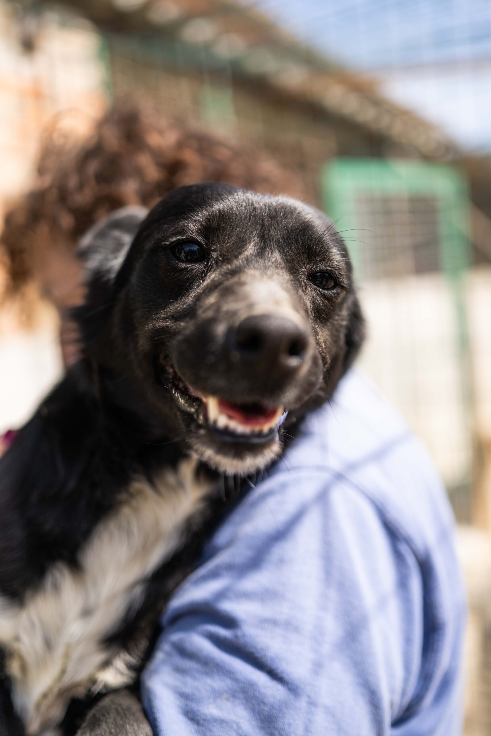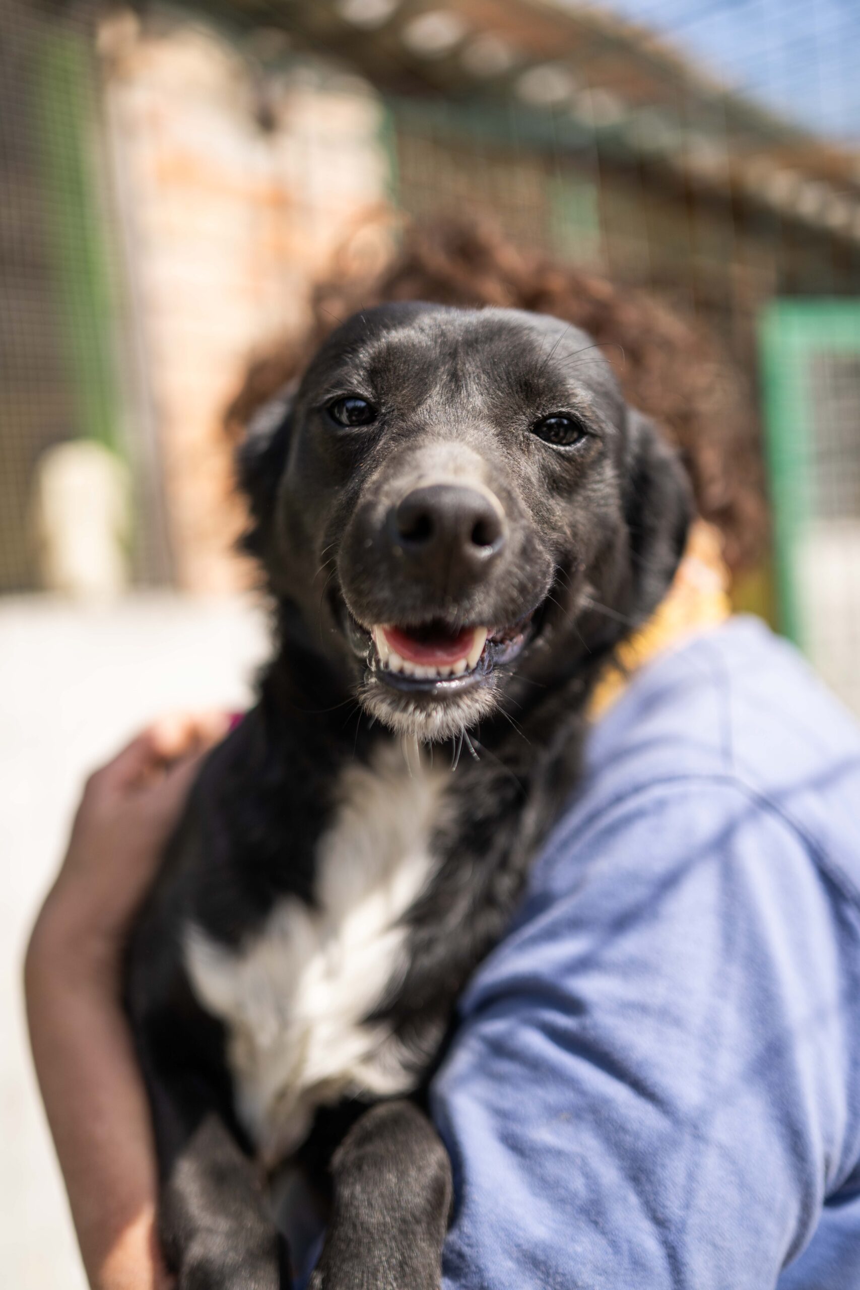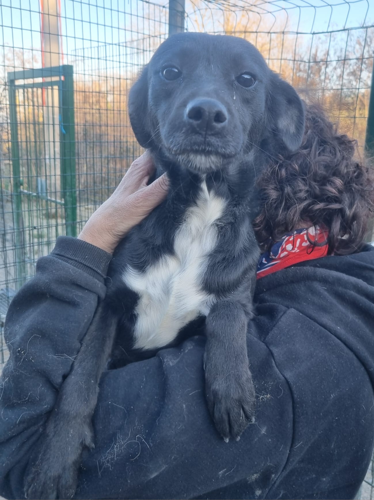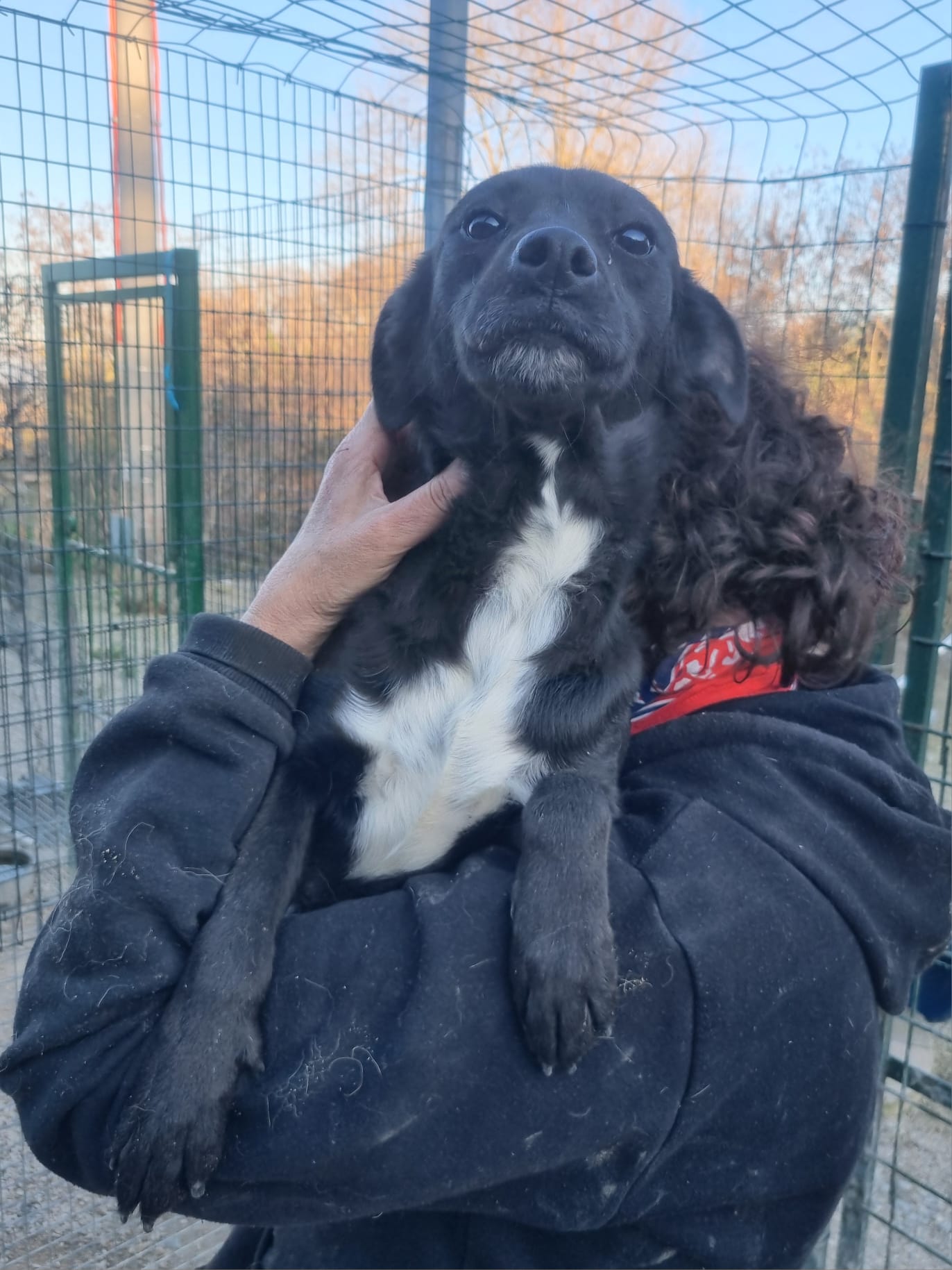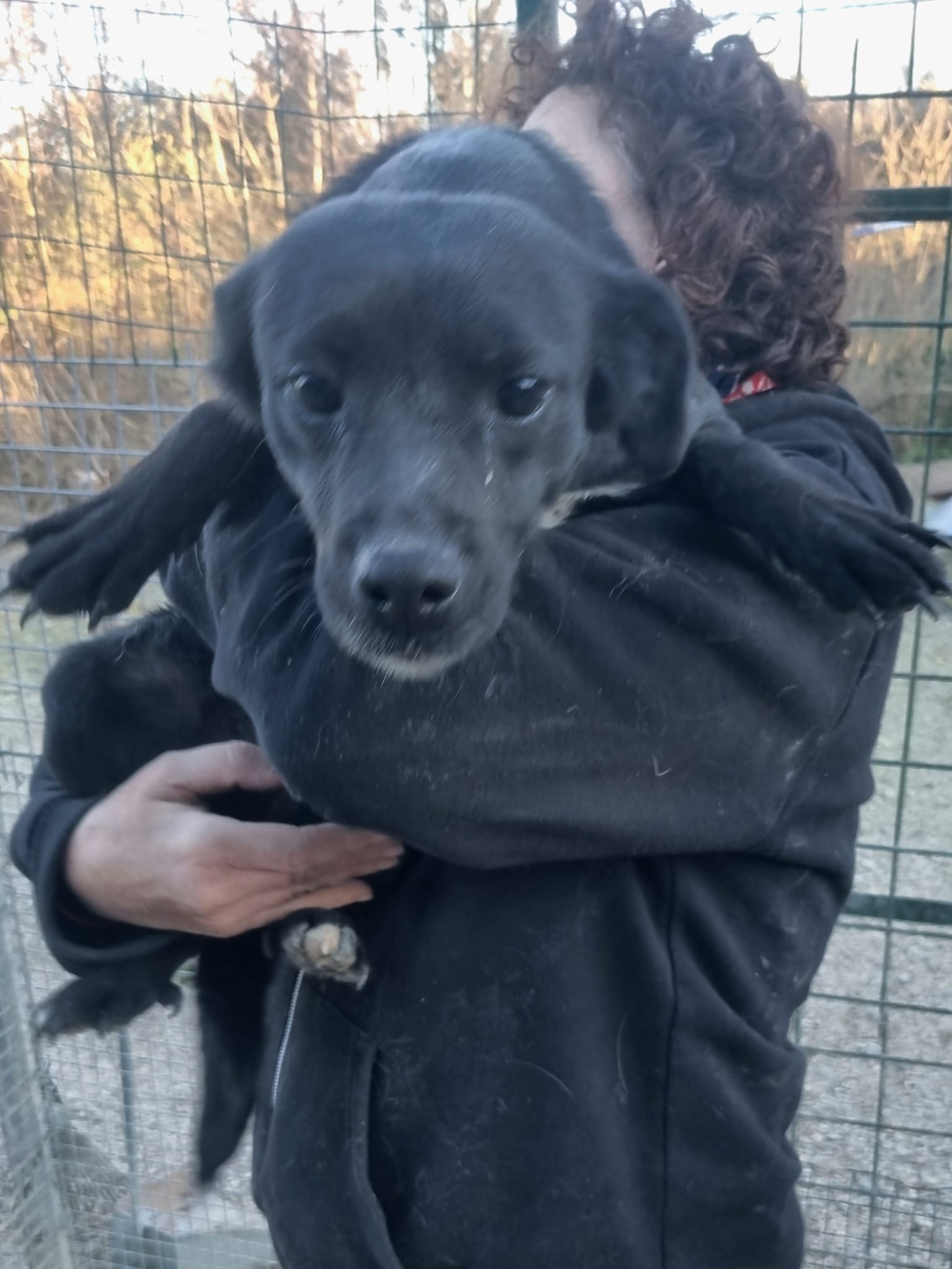 Die kleine Hündin ist ca 30/35 cm groß und bereits kastriert. Ihre MMK Tests waren negativ. Ihr freundliches Wesen konnte sie sich trotz all ihrer Erfahrungen erhalten! Als ich sie in Italien kennenlernen durfte war sie sehr aufgeregt, unruhig. War doch ihre Bezugsperson Brunella endlich ein paar wenige Minuten am Tag für sie da. Ombra lief fröhlich aufgeregt im Zwinger umher, sodass Brunella sie kurzerhand für die Fotos auf den Arm nahm.