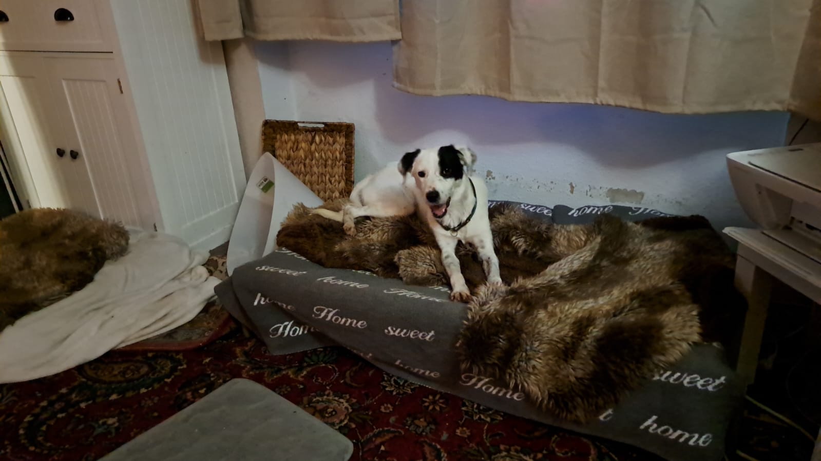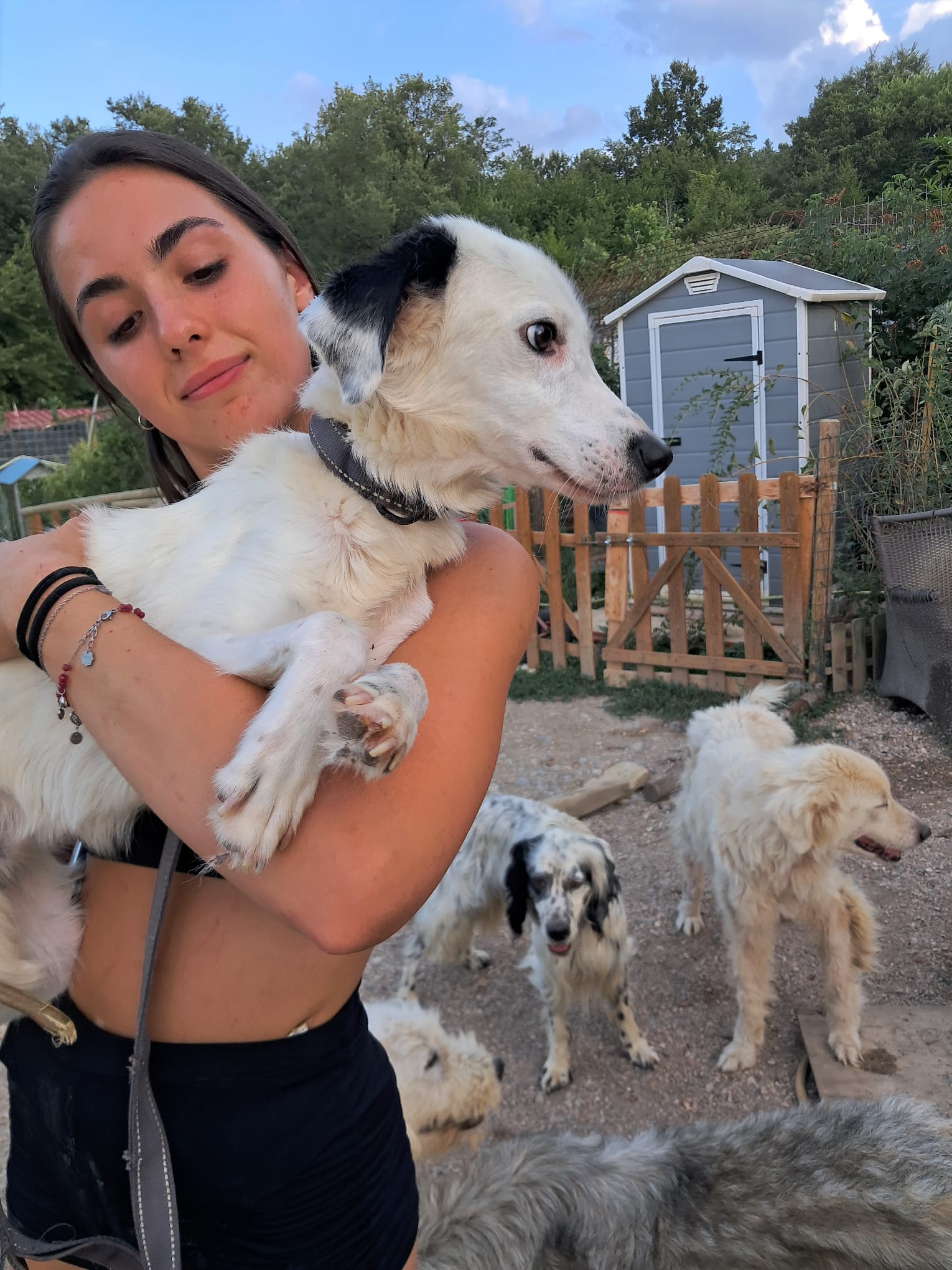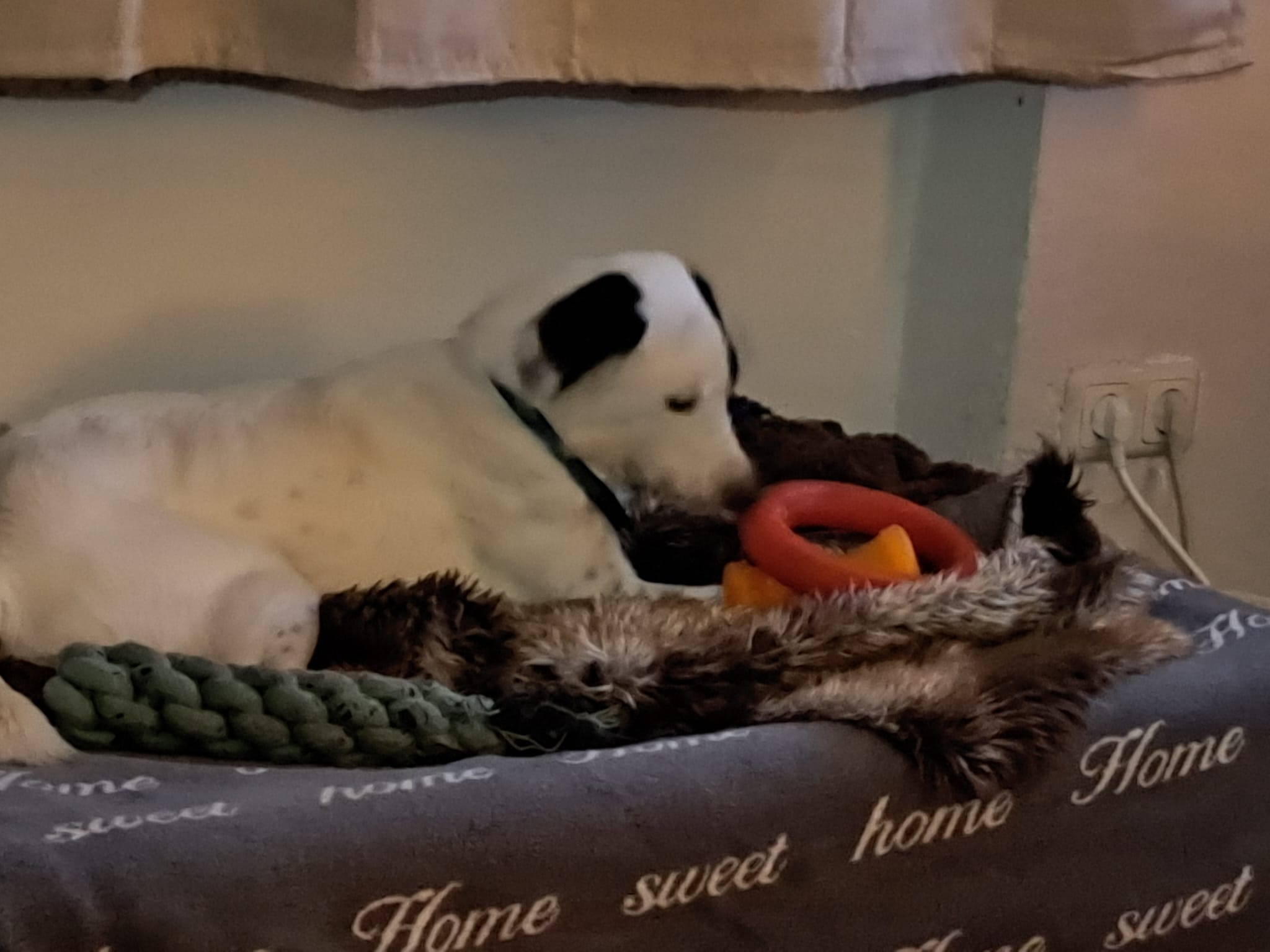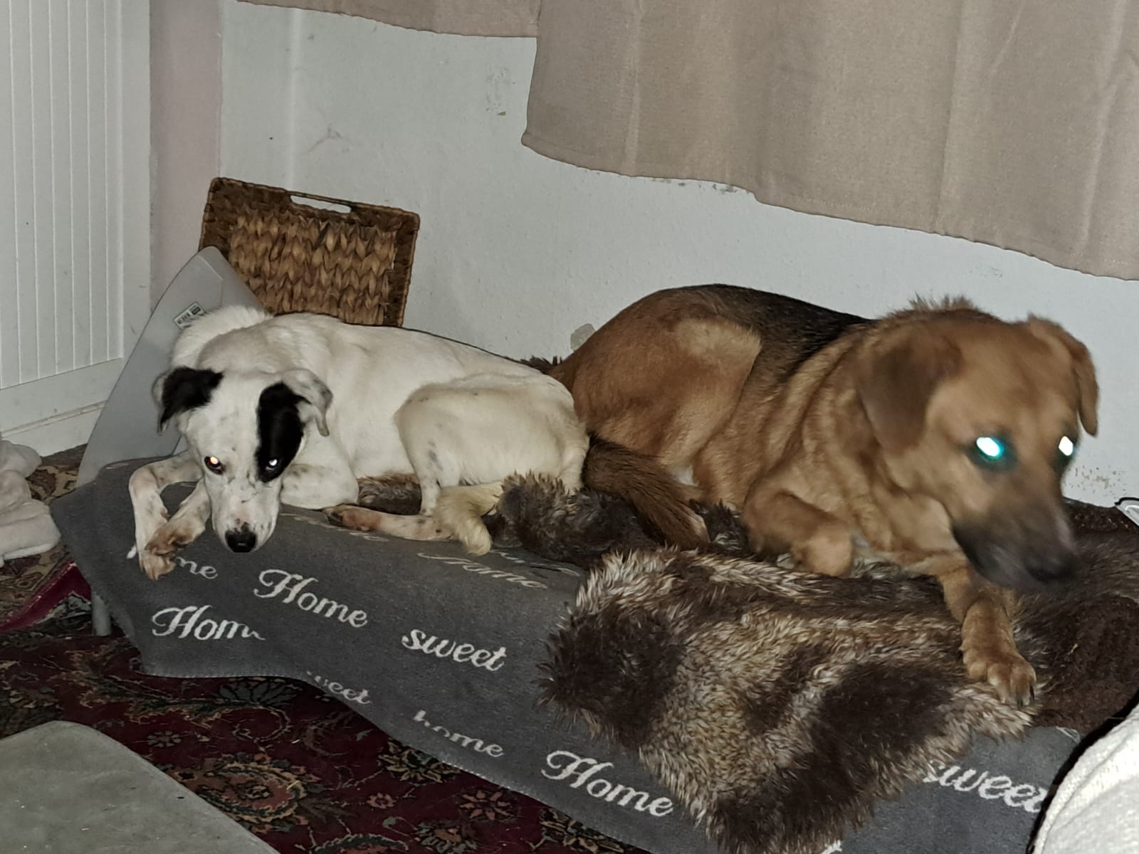 Theo hatte sein Bein gebrochen. Es wurde eine Platte eingesetzt. Die Tierschützerin macht mit ihm Physio und es schaut alles gut aus. Jetzt fehlt nur noch ein Zuhause. Der Bub hat sehr abgenommen und braucht endlich Ruhe.