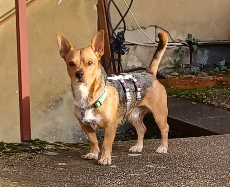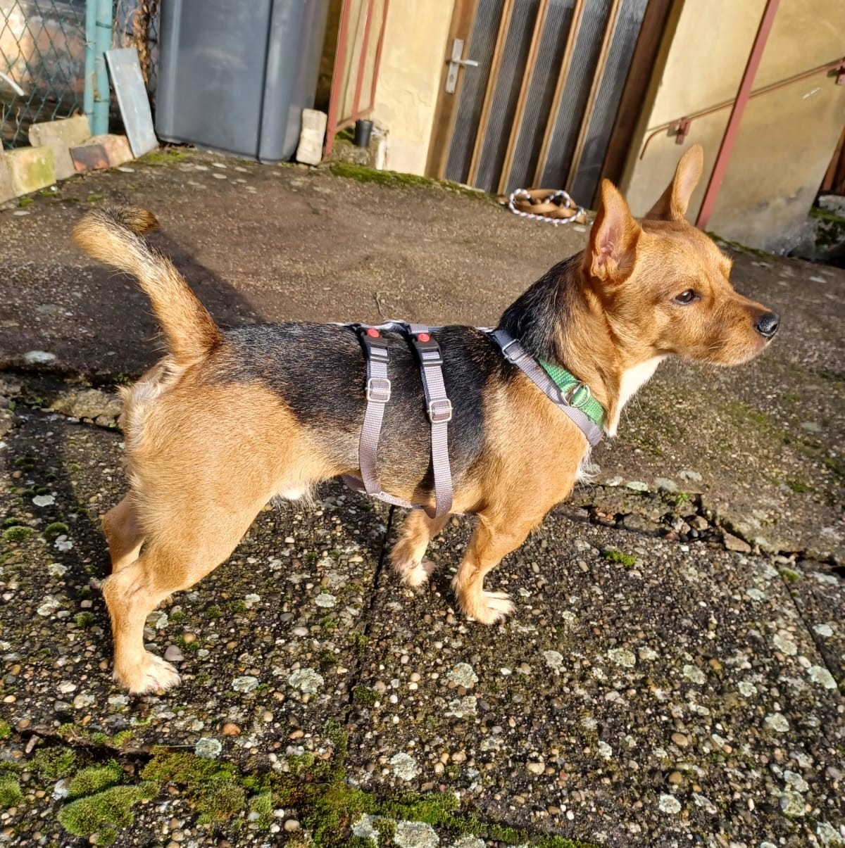 Er ist ein kleiner Mischlingsrüde von 6kg und ca.27/30 cm.
